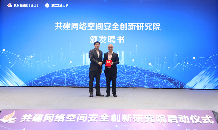 郑迪为滨江区浙工大网络空间安全创新研究院院长宣琦颁发聘书。