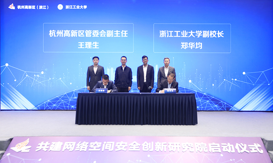 5月13日下午,我校与杭州高新区(滨江)共建“滨江区浙工大网络空间安全创新研究院”启动仪式在滨江举行。学校党委书记蔡袁强与区委书记章登峰出席并致辞。校长李小年、副校长郑华均,区委副书记、区长郑迪,区领导陶峰、王理生出席。