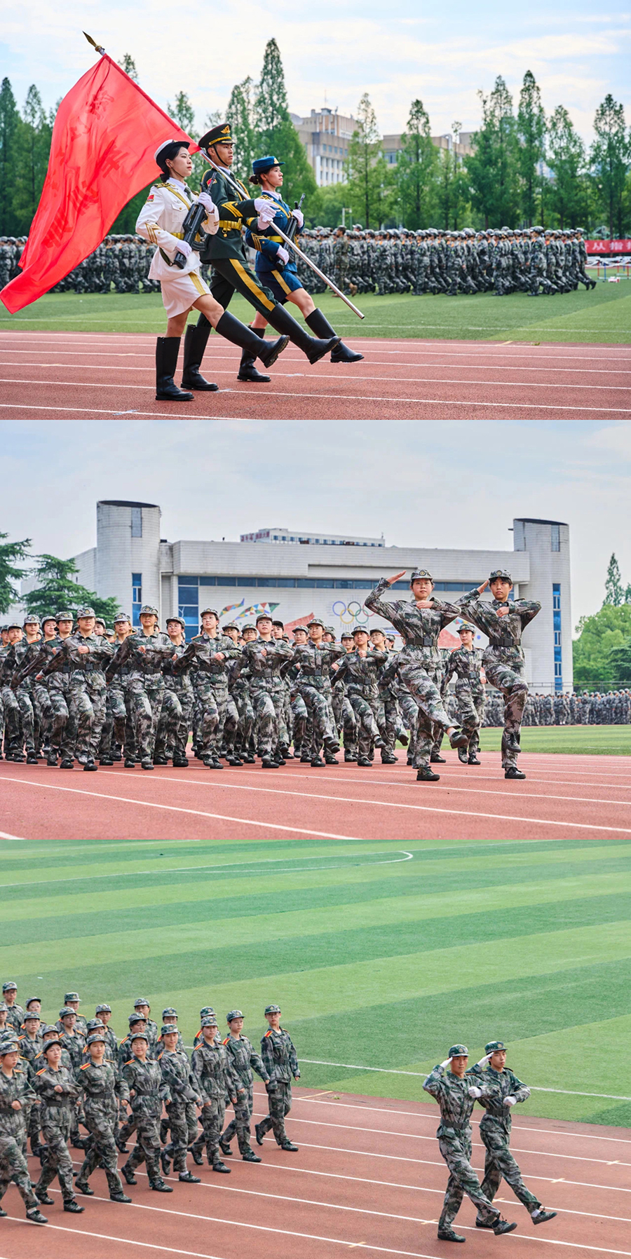 5000余名工大学子意气风发、斗志昂扬,充分展现了朝气蓬勃的青春活力和强国有我的必胜决心!分列式方队步伐整齐、铿锵有力、气势高昂;擒敌拳、刺杀操、匕首操表演刚劲迅猛、踢腿如风、出拳有力;战场综合演练、班组战术训练表演贴合实战、配合默契、敢打敢拼!