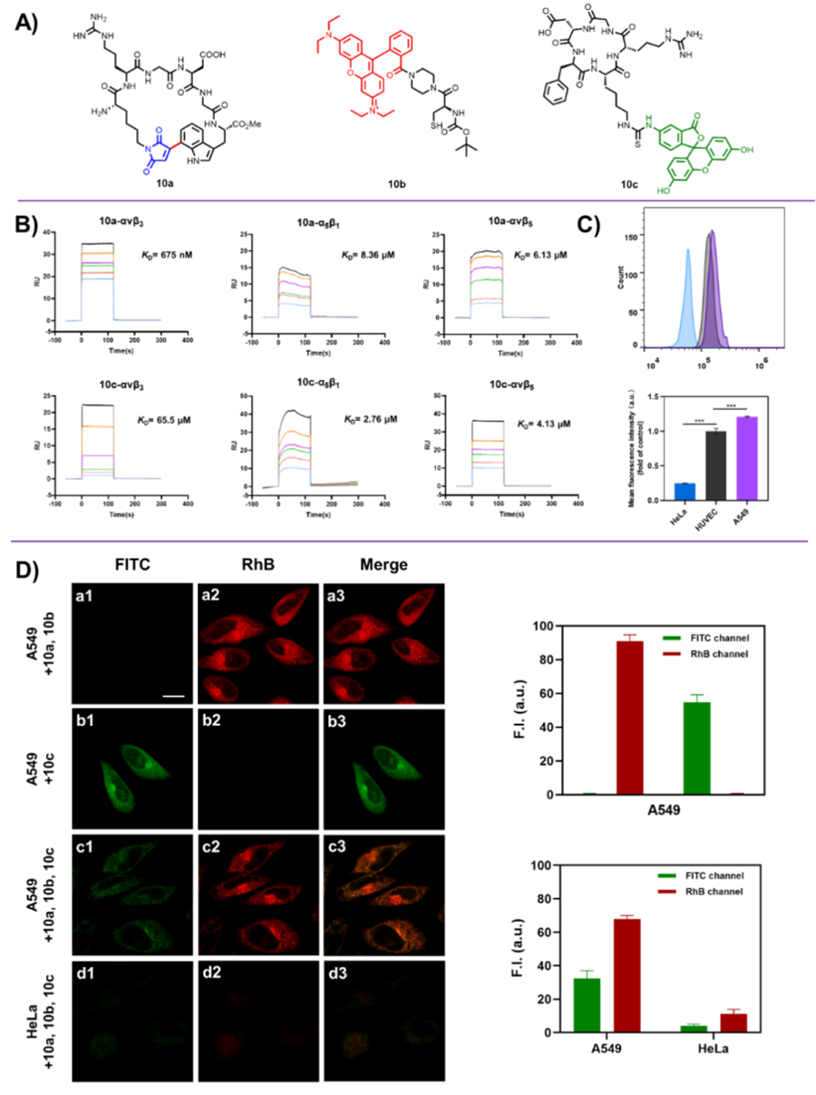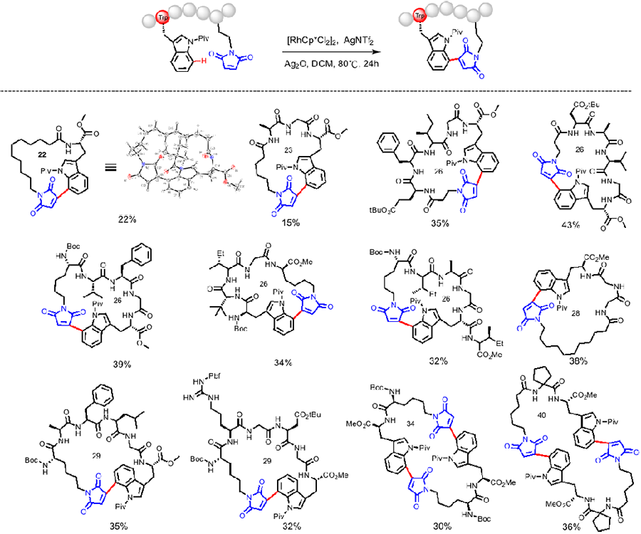 该课题组的研究打破常规环化策略的局限性,利用过渡金属铑作为催化剂,在温和的条件下成功实现了多肽色氨酸惰性C(7)-H键上位点特异性马来酰亚胺环化,具有很好的底物兼容性,并制备了22-41元环的环肽。还利用色氨酸取代的马来酰亚胺与巯基的点击反应特性,发展了一种快速、高效构建多肽偶联药物的独特方法。以整合素靶向多肽RGD为例,通过色氨酸C(7)-H的马来酰亚胺环化反应构建了具有高整合素亲和性的RGD环肽,然后通过与含巯基阿霉素之间的生物正交反应成功构建了多肽药物偶联(PDC) RGD-GFLG-DOX,并经分子互作、流式细胞术及竞争性等实验,验证了该PDC药物化合物比常用的DOX具有更好的选择性、结合亲和力和抗肿瘤细胞增殖活性。这种快速制备环肽的策略可能成为构建PDC的强大工具,在化学生物学和药物化学中有着广阔的应用前景。