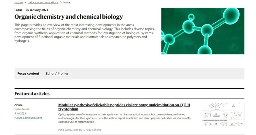 近日,我校生物工程学院朱勍教授团队以浙江工业大学为第一单位和唯一通讯单位在国际顶级期刊《Nature Communications》发表文章《Modular Synthesis of Clickable Peptides via Late-stage Maleimidation on C(7)-H Tryptophan》,并被编辑重点报道。生物工程学院2022级博士研究生王鹏为第一作者,2021届博士研究生刘江和2021级硕士研究生朱小梅为论文共同第一作者,朱勍教授为通讯作者。该杂志是Nature系列期刊中的综合类子刊,最新IF为17.694。
