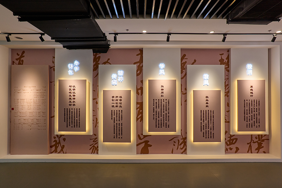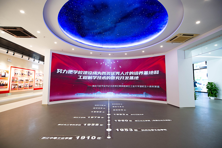 主展厅以时间为轴线,彰显了学校70周年栉风沐雨的办学历史,以“厚德健行”校训、“三创精神”和“两个基地”建设为主线,以重点事件、重点成果为亮点,重点突出“以浙江精神办学,与区域发展互动”的办学特色。其中,创新成果展区全面展示了学校建强“两个基地”、创建一流大学的办学成就,精选部分科研成果,反映新时代工大担当;校友风采展示了业界校友、学界校友、政界校友和最美校友,体现工大育人成就;尾厅还增设了校友综合服务查询一体机、部分标志性亚运物品等。改造升级后的校史馆,还可以根据参观者的时间安排,定制参观流线,模块化组合展陈主题。