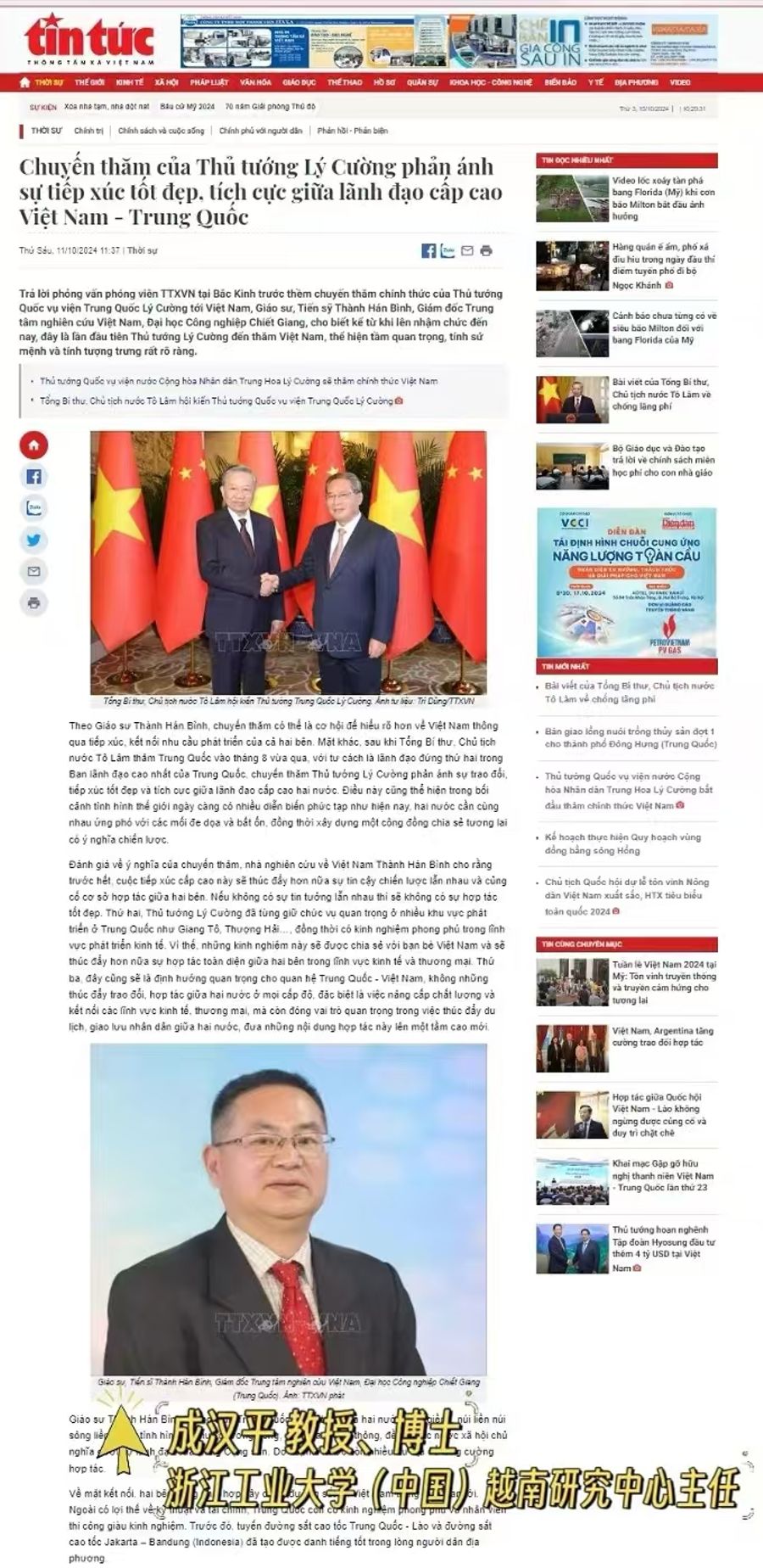 值国务院总理李强访越之际,浙江工业大学越南研究中心(东南亚研究中心)主任成汉平教授应邀接受越通社驻京记者采访,谈中越关系及此次访问的重要意义。
