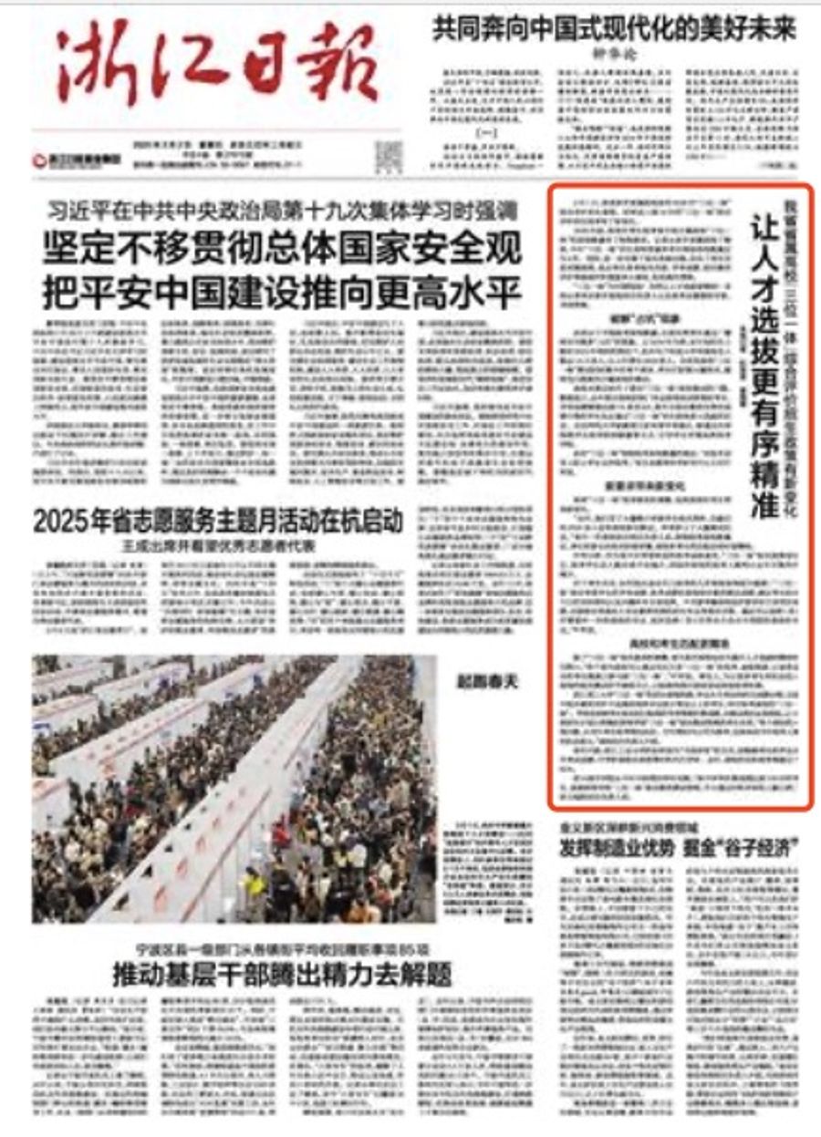 3月2日,《浙江日报》与潮新闻客户端分别以《让人才选拔更有序精准——我省省属高校“三位一体”综合评价招生政策有新变化》《浙江高校“三位一体”报名启动!招生政策解读及报考建议看这里》为题,报道我校启动浙江省2025年省属高校“三位一体”招生启动。我校“三位一体”招生的初审改为“书面评审”的方式,根据考生的学业水平考试成绩、中学阶段综合表现等材料先行评审,让高校和考生匹配更精准。