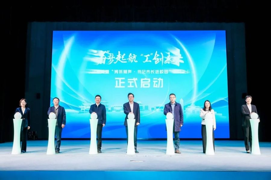 蔡袁强、胡军、姜少飞、张昆仑、娄丹丹、王奋、童云英共同启动“‘诸’梦起航 ‘工’创未来”浙江工业大学诸暨周暨“溯采潮声·书记市长进校园”研究生就业促进活动。