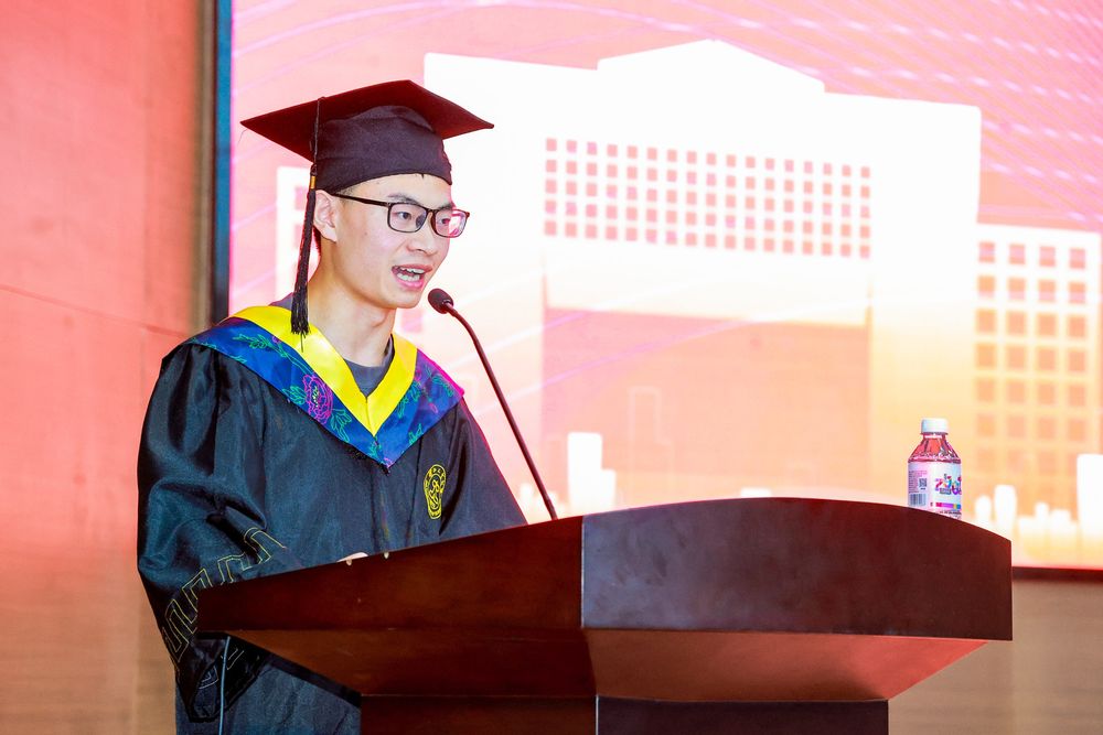 2025届生物化工专业博士涂帅作为研究生毕业生代表发言。他回顾了自己七年的学术历程,分享了在合成生物学领域的三次跨越,以及在导师团队支持下取得的科研成果。他说青年学子要始终铭记“厚德 健行”校训精神和“探索未知 激情求解”院训精神,肩负历史和时代赋予的使命担当,用技术突破封锁线,将个人理想融入国家需求,为时代发展贡献青春力量。