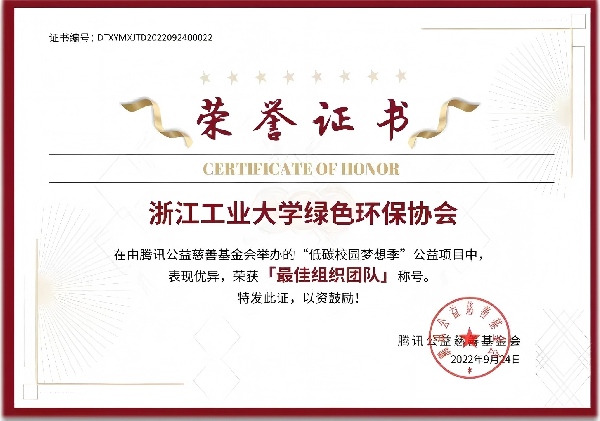 Over the years, members of the Green Association have cumulatively participated in over 5,500 person-times of environmental volunteer service, amounting to more than 40,000 hours. The association's efforts in guarding clear waters and green mountains and transmitting "green" power have received support and recognition from units including the Zhejiang Provincial Department of Ecology and Environment, the Provincial Committee of the Communist Youth League, the Hangzhou Municipal Bureau of Ecology and Environment, as well as the university and college Youth League committees. The association has successively received honors such as the 2021 National "University Students in Action" Outstanding Student Club, the 2022 National Top 100 "Vibrant Student Clubs" in Universities and the Top 5 "Vibrant Student Clubs" in Zhejiang Province, the 2022 Tencent Charity Low-Carbon Campus Dream Season "Best Organizational Team," and the 2023 Campus Top Ten Student Clubs.