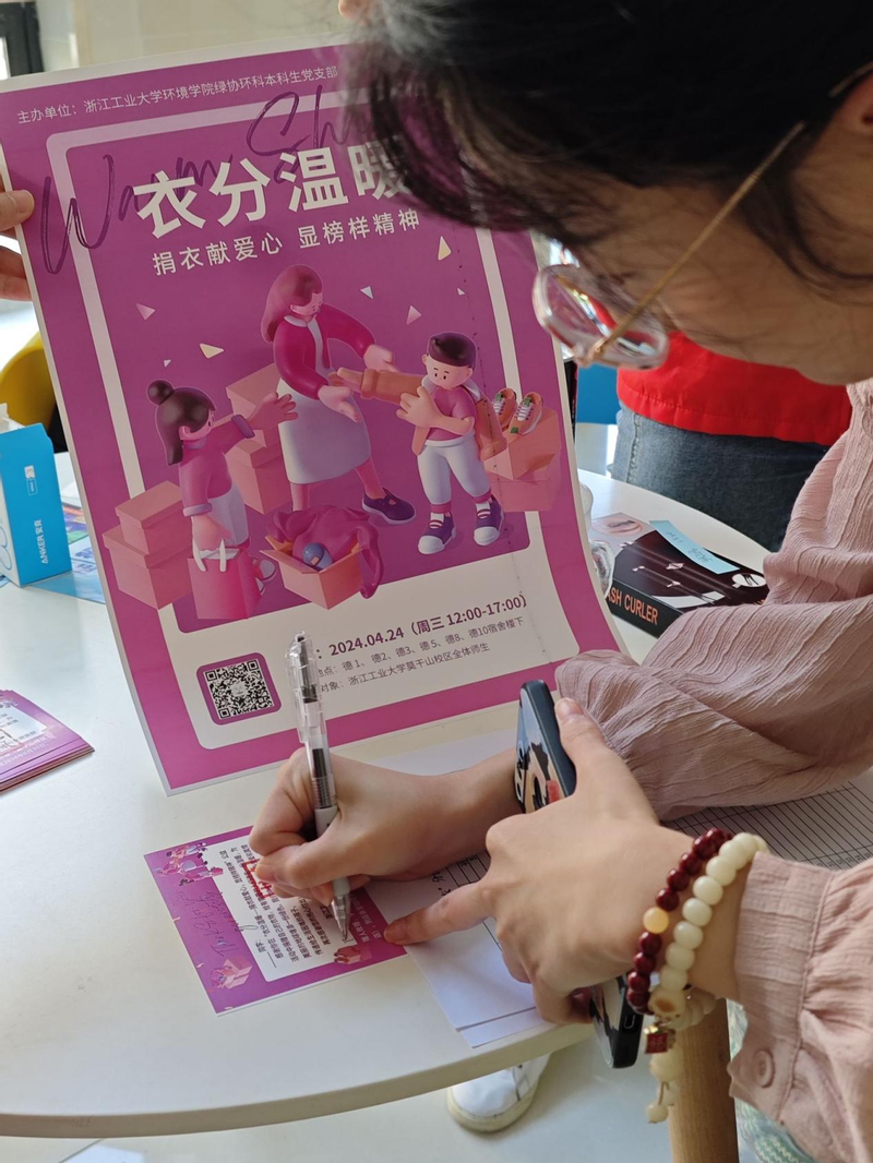 4月24日,绿协环科本科生党支部开展了以“‘衣分’温暖,一份喜悦”为主题的旧衣回收活动。支部在莫干山校区各个主要寝室楼下放置了衣物回收点并张贴海报。在志愿者的帮助下,旧衣回收工作顺利收官,每一位有爱心的捐赠者都被记录下来,并发放爱心礼品。