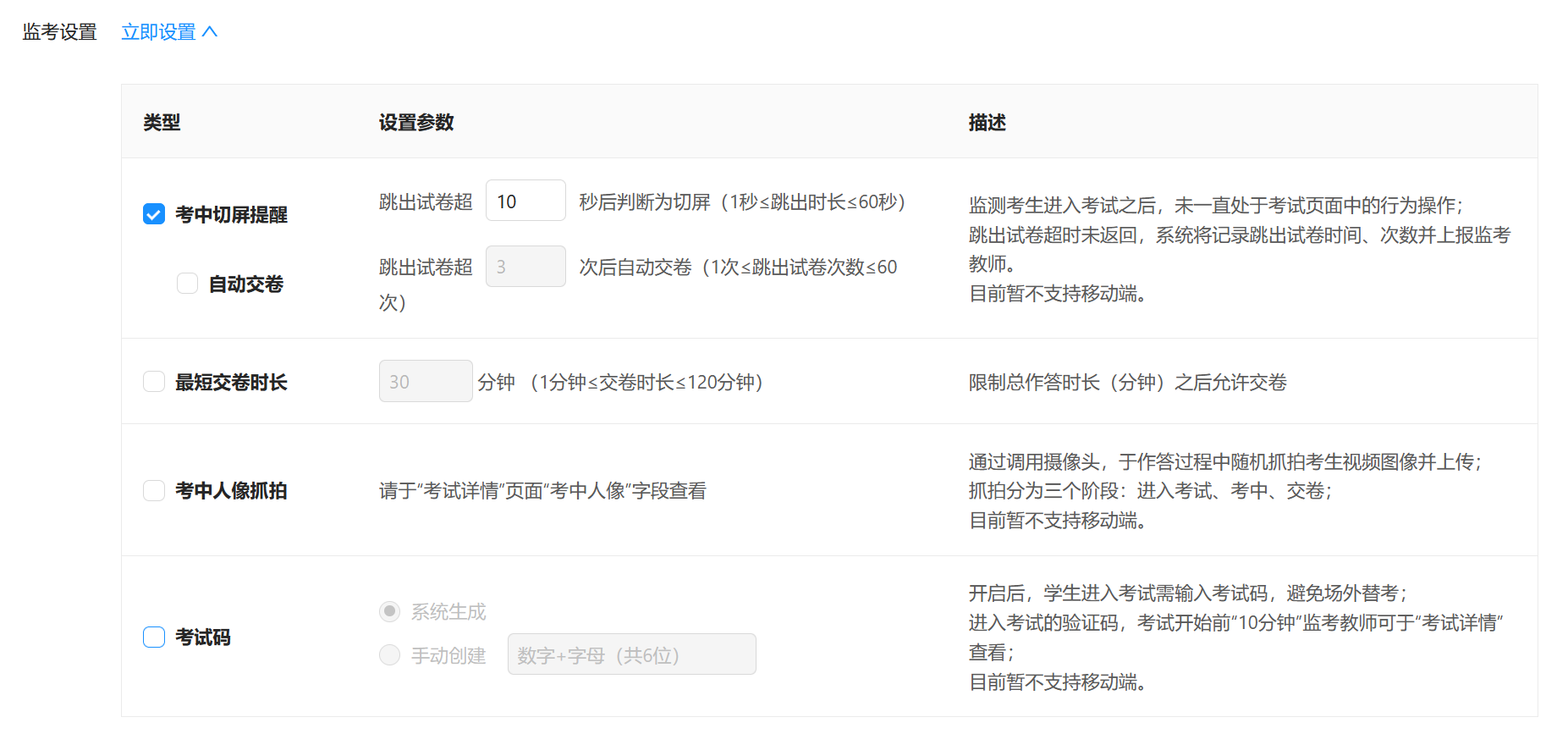 ⑨监考设置:点击「立即设置」,可展开列表,有四项功能(如图,详细介绍请见图中描述)