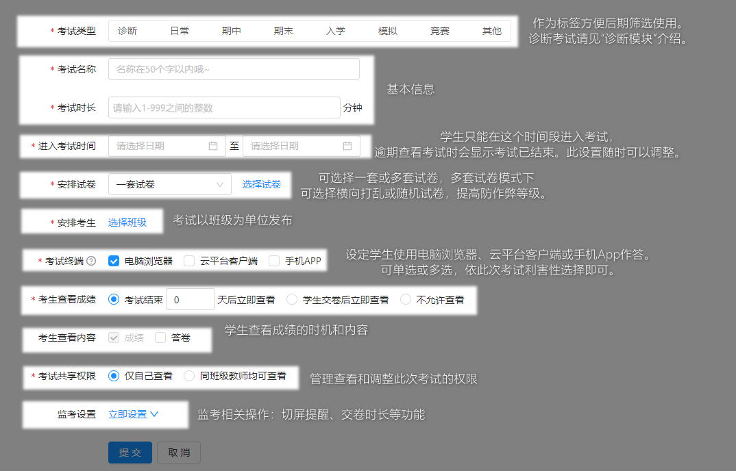 ①考试类型:作为标签,iTEST系统提供了常见分类,便于后续按类查找、筛选和管理考试。诊断类考试需要学校先开通相应模块,具体介绍请见诊断模块文档。