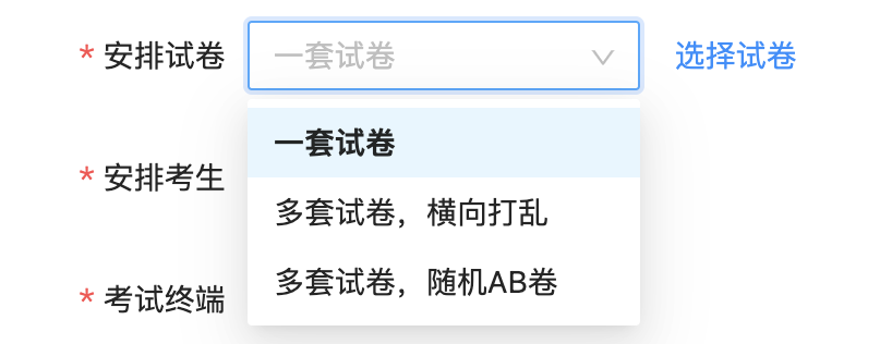 多套试卷,随机AB卷:选择多套试卷,学生会随机抽到某卷,系统会打乱选项顺序。