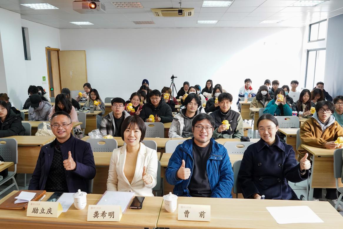 在随后题为“厚德健行,青创未来”的新年第一课中,龚希明为大家介绍了义乌市的概况、经济和市场背景。她指出,义乌是全国改革开放的18个典型地区之一,拥有90余万市场主体,同时也创造了数百万个就业岗位,新就业形态蓬勃生长。义乌具有完善的人才发展“生态圈”,聚焦高校毕业生这一重点群体,义乌市全力做好就业全周期扶持、创业全链条孵化和服务全业务贯通,营造就业创业“零成本”、服务“零距离”、成长“零门槛”的宜业生态,成为高校毕业生就业创业“向往城市”。龚希明还从大学生的实习、就业、创业、生活四个方面,为大家介绍了典型案例,并讲解了义乌市相关人才政策和就业创业环境。她表示,义乌市对于大学生有生活补贴、实习补贴、交通食宿补贴、人才购房及人才租房补助等全方位的就业帮扶政策,同时欢迎浙江工业大学外国语学院的学子积极赴义乌参观访问、就业创业。最后,针对同学们关于电商行业薪资待遇、企业招聘标准、日企文化氛围等相关问题作了解答。