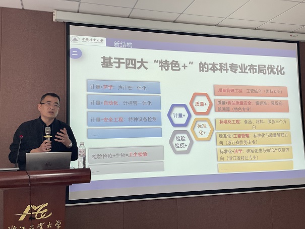 孙卫红教授围绕专业建设新理念、新理念下的专业建设新思路及专业建设新结构三个方面阐述了他对于专业建设的理解和实践。他指出,专业建设应对标工程认证,夯实专业底色;结合学校特色和行业新业态和新技术,明确专业人才培养目标,强化专业特色,提升专业亮色;拓展“特色+”专业内涵,建立专业建设新结构,打造特色专业的品牌化和交叉化及通用专业的特色化和综合化。他以中国计量大学专业建设为例,分析了新学情下的专业建设面临的压力和挑战,并分享了基于四大“特色+”的本科专业布局优化开展及创新创业教育课程体系建设及实施情况。他还分享了所授《工程图学》课程建设经验及课程教学管理的技巧,为在座教师上了一堂生动的“教学示范课”。