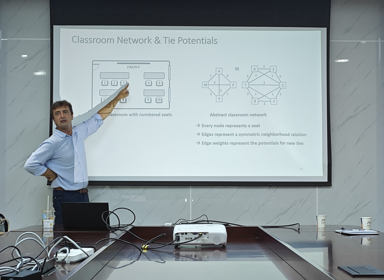 Alessandro Hill博士通过提问引出论文的主题,介绍了论文的研究动机:调查显示学生在校园内认识的人数量较少,直至毕业仍有陌生的同专业同学。Alessandro Hill博士从学生小组作业切入,将其建模为一个NP-hard问题。以最小化队内学生社交联系为目标,加以队伍容量、单一队伍安排等约束条件,利用优化算法进行求解该问题,并展示了在实际课堂情况中,学生社交圈变化的实验结果。Alessandro Hill博士还介绍了学生在教室内座位的排布对其社交影响的研究。该研究在第一个针对小组作业的研究的基础上进行发散,从10人小规模教室到30人或更多人数的教室情况进行讨论分析。作为一个新颖的话题,引起了在场老师同学们的强烈兴趣。