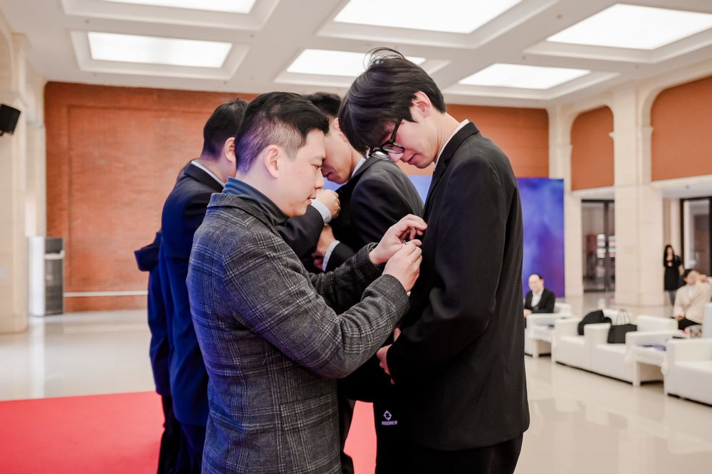 深蓝学员向导师们行拜师礼,导师为学员们佩戴深蓝徽章,标志着从此刻开始,深蓝导师与学员之间正式缔结师生之情,深蓝导师们也将履行导师职责,不断引导、激发青年学子创新创业的激情和潜能,共同打造机械精英人才培养新平台。