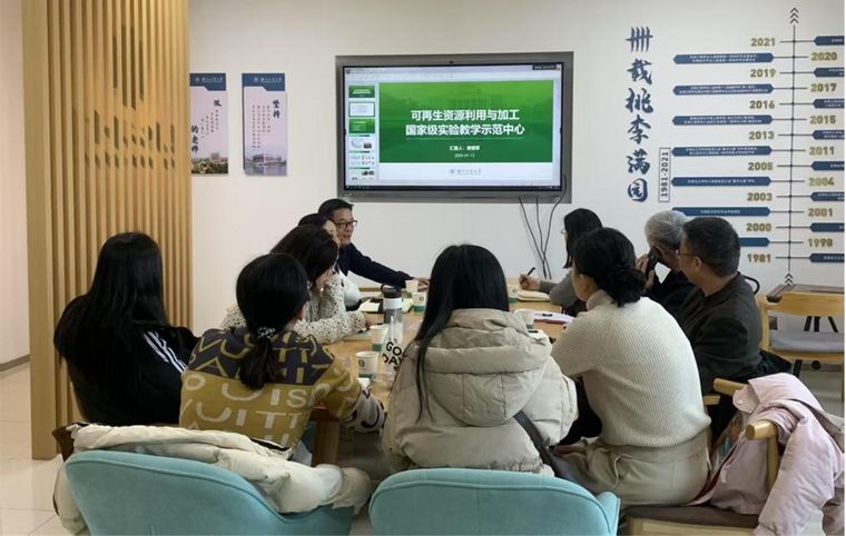 在生物工程学院实验教学中心,主任章银军和副主任黄海婵两位老师则向大家介绍了国家级实验教学示范中心——可再生资源利用与加工实验室的发展历程及科研成果。章银军建议实验中心教师应不断提升教研能力,更好促进实验室建设发展。此外,一行人参观了相关实验室及文化长廊,深入了解了实验室布局规划、建设理念和管理经验。