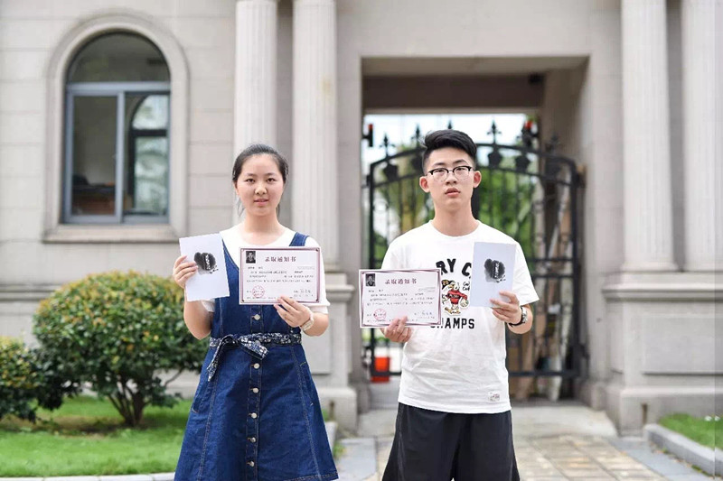 图1:薛竞祎(左)、潘圣益(右)领到录取通知书