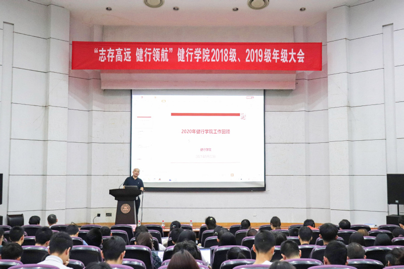 本次年级大会共分三部分。第一部分,学院党总支书记兼执行院长王家德回顾总结了学院过去一年的工作,展示了丰硕的育人成果,阐述了健行学院拔尖创新人才培养理念和新一轮改革方案重要内容,指出“凡成大事者,必大毅力,强思维,大格局”,希望健行学子在求学路上志存高远,追求卓越。