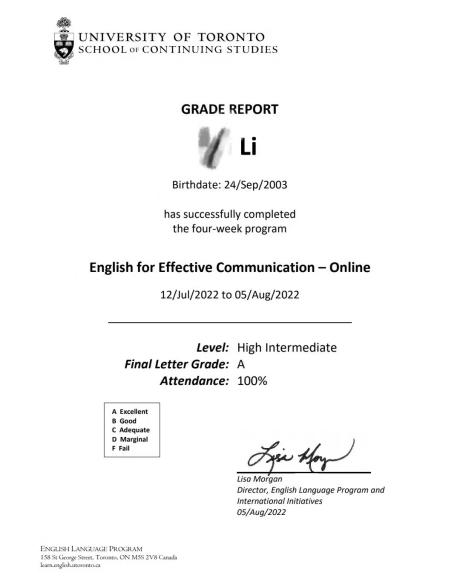 多伦多夏校结课证书