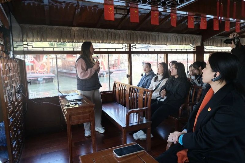 最后一站,师生们乘船至湖心岛,倾听清代嘉兴知府许瑶光的廉政故事,体会“为民情怀”,在提高思想境界的同时,感受嘉兴悠久的清廉历史文化。在稍作参观后,面对烟雨楼,师生们在中共一大纪念船旁合影留念。