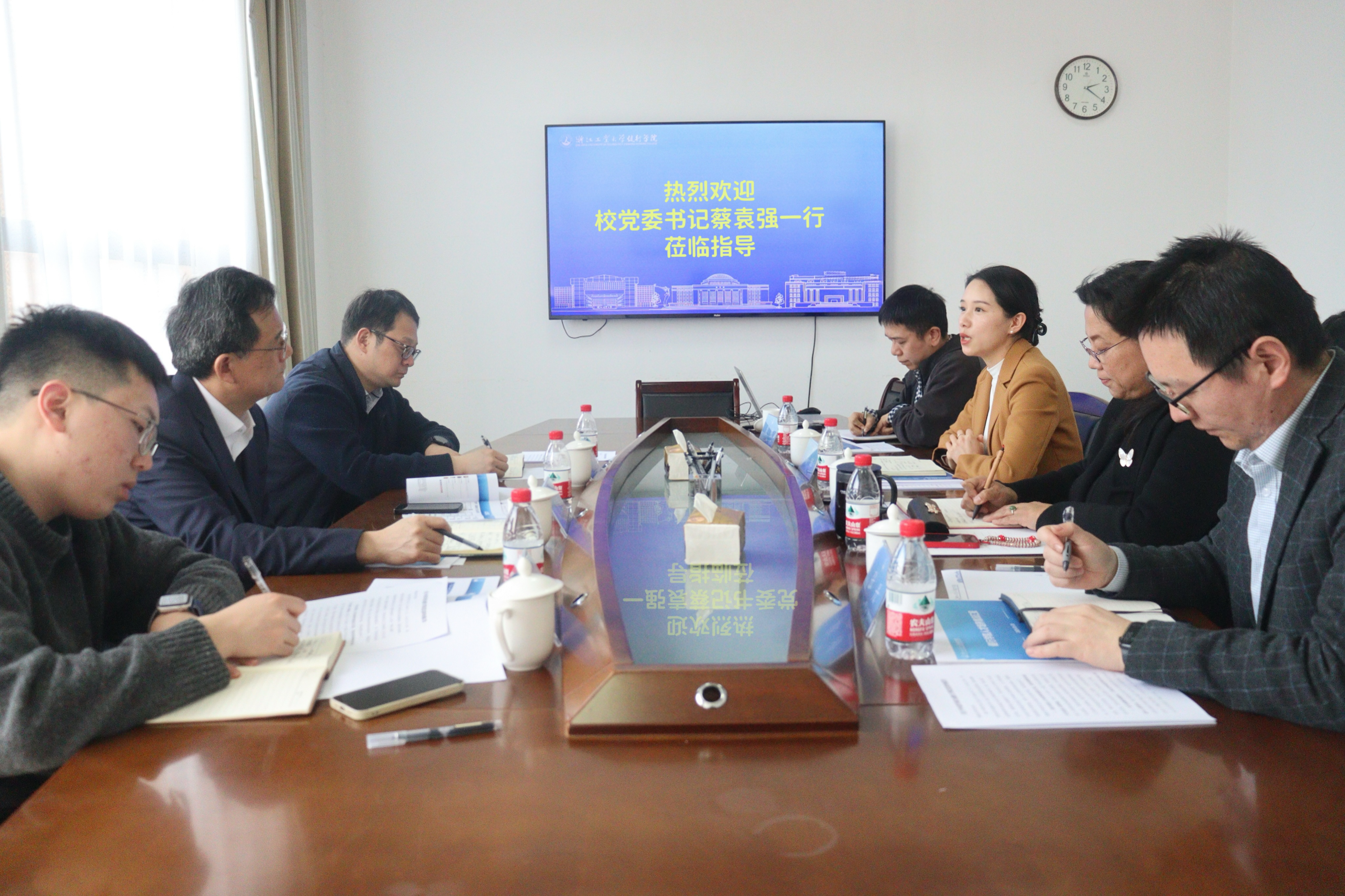 蔡书记认真听取了学院人才培养情况汇报,充分肯定健行学院近年来的工作成效。他指出,健行学院历经20年积淀,已发展成为彰显学校育人高度的“金字招牌”,新一届领导班子要以更高站位谋划发展,将人才培养质量转化为“招生-培养-就业”一体化卓越人才培养模式的“金名片”。他对学院提出三点期望和要求:一是要锚定使命,构建“大格局”培养体系。着力提升学生家国情怀、国际视野、创新精神和实践能力,让健行学子有更高的价值目标和追求,为建设“中国特色、世界一流”大学、创新浙江、中国式现代化贡献力量。二是要深化改革,推进专业学院“协同”培养机制。持续加强“导师制”,切实落实“一生一案”的个性化培养,提前让学生进入优秀的科研团队,在科创能力培养和国际化育人方面加强协同。三是要与时俱进,布局人工智能新赛道。探索人工智能赋能拔尖创新人才培养,推进AI通识课教育改革。
