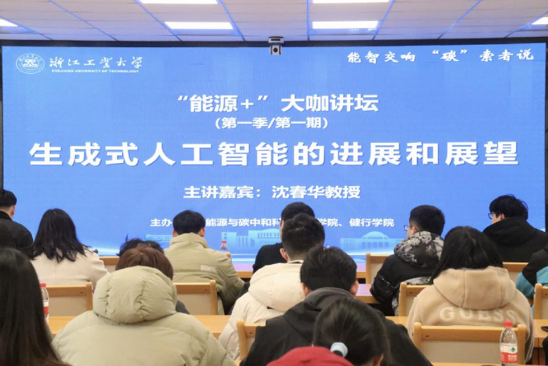 沈春华教授应邀作题为《生成式人工智能的进展和展望》的专题报告。能源与碳中和科教融合学院党总支书记李开元、副院长胡艳军、能源与可持续发展研究院副院长余武斌及师生代表齐聚一堂,共探人工智能技术革命与能源创新的深度融合之路。