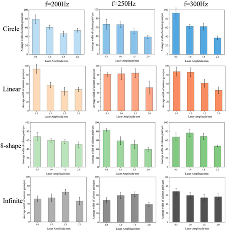 图3. O-WLAM不同摆动形式下单道柱晶粒宽度比较。