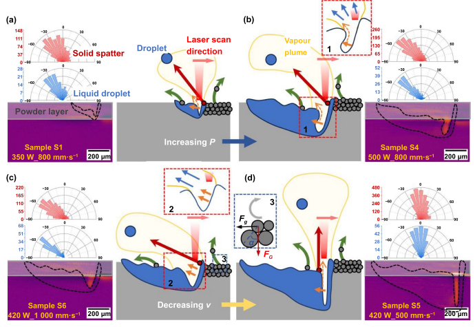 图3. 固体飞溅/液滴运动与锁孔/凹陷区形貌间的关系示意图,其中(a)和(b)表示激光功率增加的效果,(c)和(d)为激光扫描速率降低的效果。