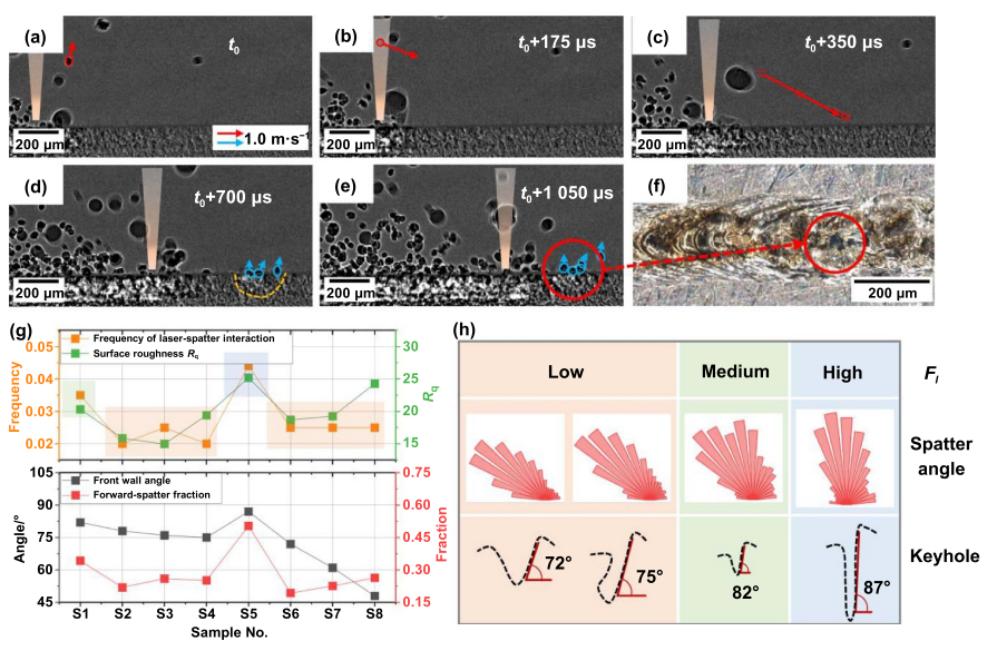 在LPBF过程中,过大的飞溅物不仅会在零件表面留下痕迹,增加缺陷和粗糙度,还可能滞留在后续构建层的粉末床上,诱发缺乏融合的孔洞。而轻微飞溅对最终产品性能的潜在影响尚存诸多未知。尽管已有大量文献采用原位高速相机或纹影成像技术捕捉粉末表面的飞溅与蒸汽羽流,但LPBF期间蒸汽凹陷(或称匙孔)形态变化的细节描述上仍显不足。同步辐射X射线源因其卓越的时间分辨率(高达1MHz),成为了记录LPBF过程中飞溅与熔池动态的理想工具。结合同步辐射X射线源与纹影成像,证实蒸汽喷射角度与凹陷区/匙孔形态之间存在紧密关联,但匙孔形态对飞溅形成的具体影响尚不明晰。