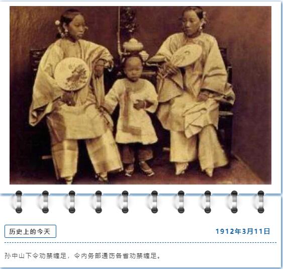 清朝被推翻后,1912年3月11日,孙中山正式下令禁止缠足。
