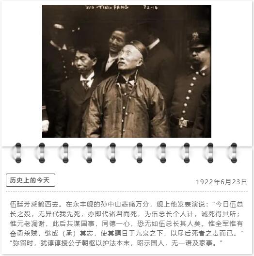 伍廷芳(1842年7月30日—1922年6月23日),本名叙,字文爵,又名伍才,号秩庸,后改名廷芳。汉族,广东新会西墩人,清末民初杰出的外交家、法学家,出生于新加坡,3岁随父回广州芳村定居,早年入香港圣保罗书院,1874年自费留学英国,入伦敦大学学院攻读法学,获博士学位及大律师资格,成为中国近代第一个法学博士,后回香港任律师,成为香港立法局第一位华人议员。