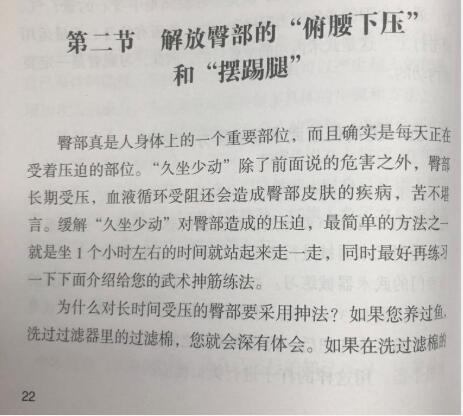 现代社会节奏越来越快,“久坐少动”成为了工作生活中的普遍现象,随之引起了各种疾病年轻化,很多年轻人也开始讲究养生。但是光有“保温杯里泡枸杞”是不够的,正如中国武术推崇的精神上健康饱满和气质上平和中正,只有“内外兼修”,才能让“筋骨皮”更加强壮,让”精气神”更加充盈。现代人经常久坐少动,一天经常坐着的时间超过8个小时,不仅使臀部本身的血液循环受阻,也影响了下肢的血液回心,再加上久坐时候上肢前倾,使得颈椎负担加重,腿部肌肉对骨骼的拉力降低,造成钙的流失。《武术养生十三篇》一书教授了解放臀部的“俯腰下压”和“摆踢腿”以及活动的内脏的“内脏升降功”等,如何用基础的武术动作来缓减久坐少动的不良后果,改善身体机能,同时练习清净平和的内心。