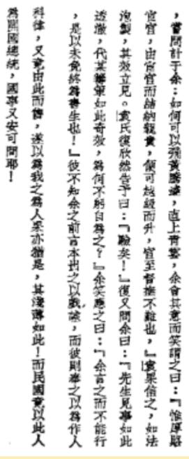 尝问计于余:如何可以飞黄腾达,直上青云,余会其意而笑谓之曰:“惟厚赂宦官,由宦官而结纳亲贵,便可越级而升,官至督抚不难也。”袁果信之,如法炮制,其效立见。袁氏复欣然告予曰:“验矣!”复又问余曰:“先生见事如此透澈,代某筹策如此奇效,为何不躬自为之?”余笑应之曰:“余言之而不能行,是以未免终为书生也!”彼不知余之前言本出之以戏谑,而彼则奉之以为作人科律,又竟由此而售,遂以为我之为人果亦犹是,其浅薄如此!而民国竟以此人为开国总统,国事又安可问耶!袁氏之所以身败名裂,国家亦因之而残破不堪者,皆私之一念害之也。