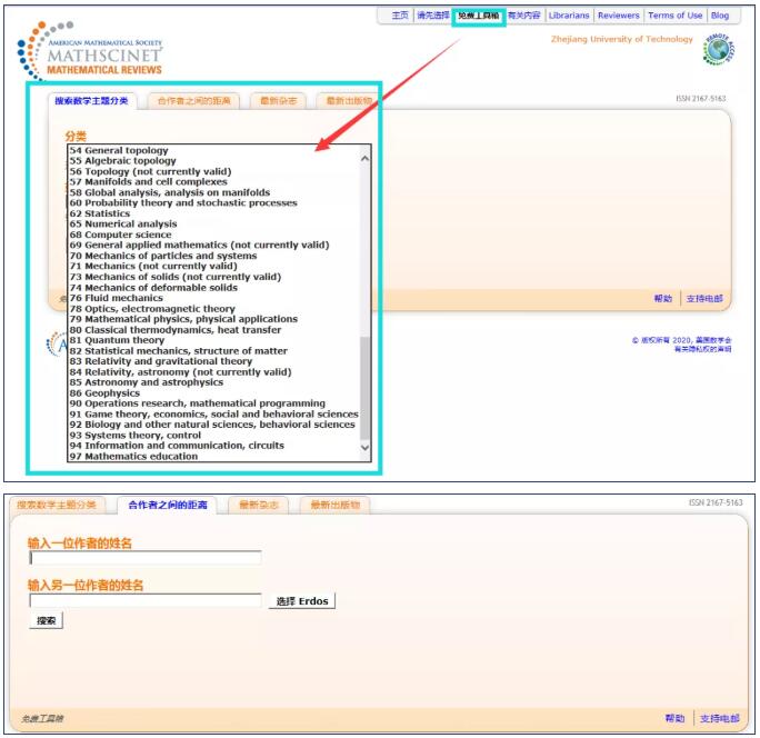 免费工具箱提供数学主题分类(97个类别)、合作者之间的距离、最新杂志、最新出版物等信息查询。