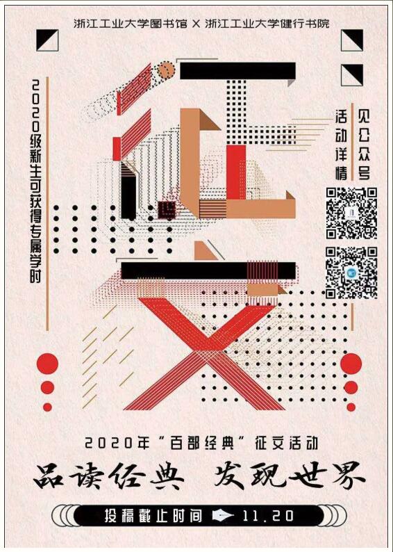 浙江工业大学图书馆联合浙江工业大学健行书院倾情推出“图书馆百部经典”征文 活动,通过阅读任一本图书馆提供参考书单中的著作,提交 1500 字以上阅读感想,让同学们从百本著作中含英咀华,将文字的魅力与自己的人生感悟融合,探索书本以外的大千世界,追寻文字和故事以外更深沉的感悟。