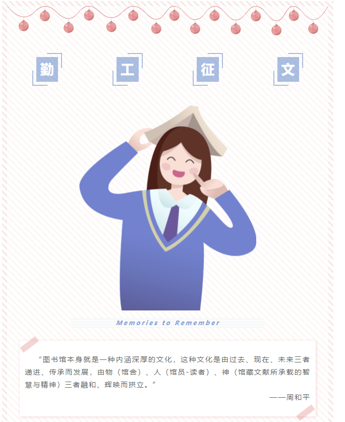 我的图书馆体验之二,就是我申请的图书馆勤工工作。在这里我遇见可爱的老师们和一起勤工的同学们,认识了在这里看书的可爱小学妹,品味到了书中的黄金屋。