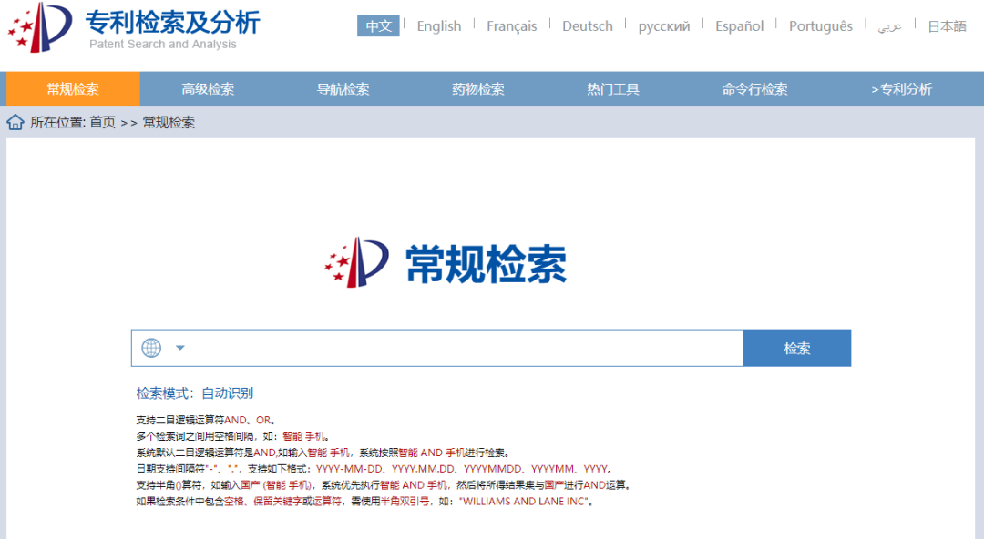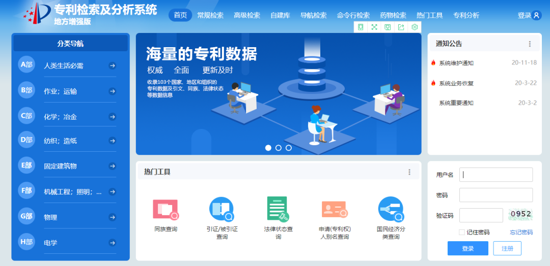 国家知识产权局专利检索和服务系统收录103个国家、地区和组织的专利数据,以及引文、同族、法律状态等数据信息,涵盖中国、美国、日本、韩国、英国、法国、德国、瑞士、俄罗斯、欧洲专利局和世界知识产权组织等,包括我国从1985年9月10日至今受理的专利。服务系统包括了5种检索模式和专利分析功能,是目前最常用的免费专利检索平台,检索需注册个人账号。