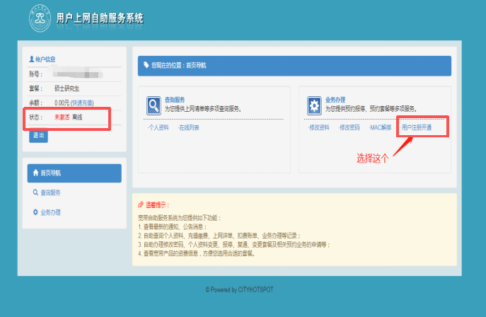 3.进入用户上网自主服务系统(如下图),输入学号,初始密码是身份证后8位(与研究生院系统的密码相同),字母X要小写。