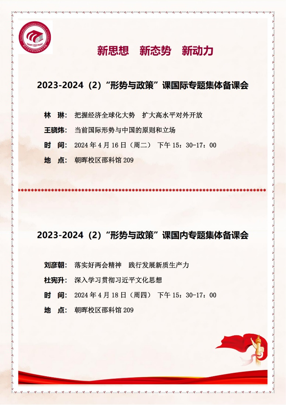 4月18日,“形势与政策”课的国内专题备课会在邵科馆209会议室召开。刘彦朝老师以《落实好两会精神践行发展新质生产力》为主题,简要分析了2024年“两会”的基本情况、中心任务、主要内容等,并重点解读了新质生产力的提出过程、科学内涵、理论意义、实践价值等议题。杜宪升老师以《深入学习贯彻习近平文化思想》为题,详细剖析了习近平文化思想的形成过程、概念内涵、理论来源、原创性贡献、国际视野等八个方面的内容。两位老师详实的课件材料、细致的讲解阐释,让与会教师对党的最新政策部署和理论成果有了深刻的了解。