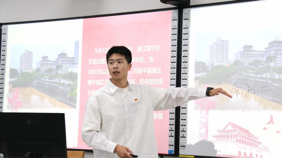 主讲人王品皓结合自身的暑期社会实践经历,强调了在当今复杂多变的国内外局势下,大学生应该紧扣时代脉搏,增强忧患意识和发扬斗争精神。