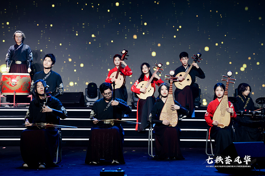 晚会分“青春如歌”“一路生花”“逐梦未来”三个篇章,在宏伟壮阔的管乐合奏《五声神韵》中拉开序幕,活动现场气氛热烈,激情昂扬。舞蹈串烧《彩云之南》《花腰傣》以轻盈而有力的舞姿,带领观众们感受傣族风情。原创器乐合奏《新霍元甲》气势恢宏,奏出了工大学子昂扬向上的精神风貌。合唱《这世界有那么多人》唱出了一代代工大人迈出追梦的步伐,让青春之花绽放在祖国最需要的地方。朗诵《写给未来的备忘录》情深意切、娓娓道来,让在场观众以敬畏之心回望历史,以昂扬斗志展望明天。演出最后,乐队串烧《献给青春的歌》《凤凰花开的路口》《诺亚方舟》《日不落》献礼七十周年校庆,以最美好的歌声表达了心底的祝愿,引发全场共鸣,现场掌声热烈。活动中,日出实业集团董事长、92届工大校友孙阳带来吉他弹唱《七里香》,与同学们一起唱出了关于青春的热忱与希望,将晚会推向高潮。