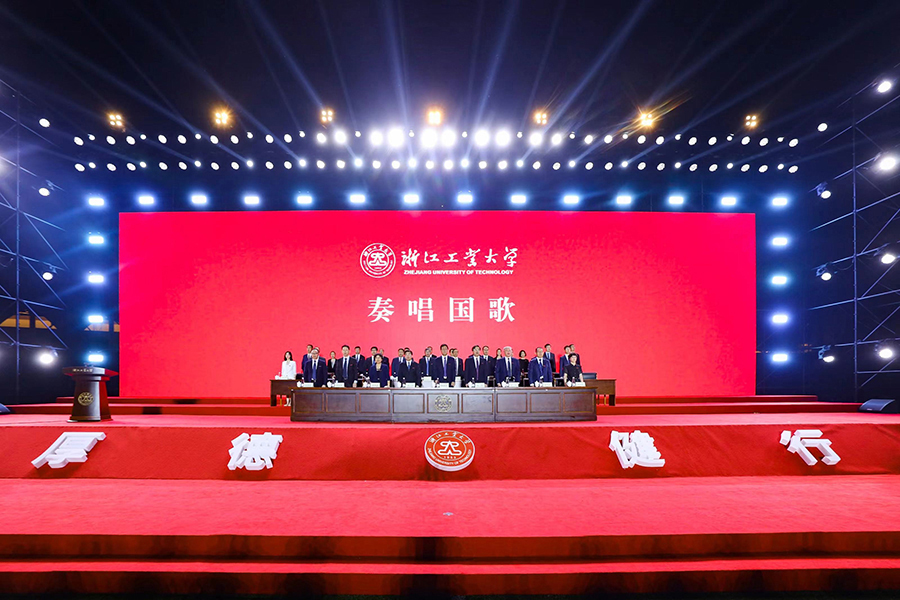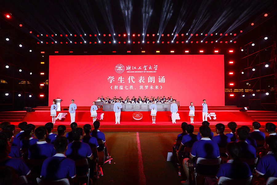 典礼上,还举行了校徽佩戴仪式,学生代表朗诵了《积蕴七秩,筑梦未来》,举行了集体生日庆祝仪式,全体合唱《浙江工业大学校歌》。