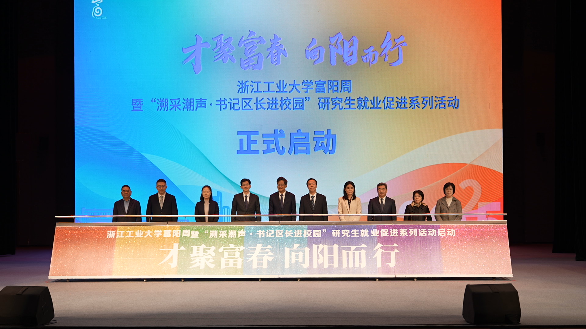蔡袁强、王牮、谢渐升、胡军、吴巨慧、尹凡、李洁、陈萍、张锦、宋新剑共同启动“才聚富春,向阳而行”浙江工业大学富阳周暨“溯采潮声·书记区长进校园”研究生就业促进系列活动。