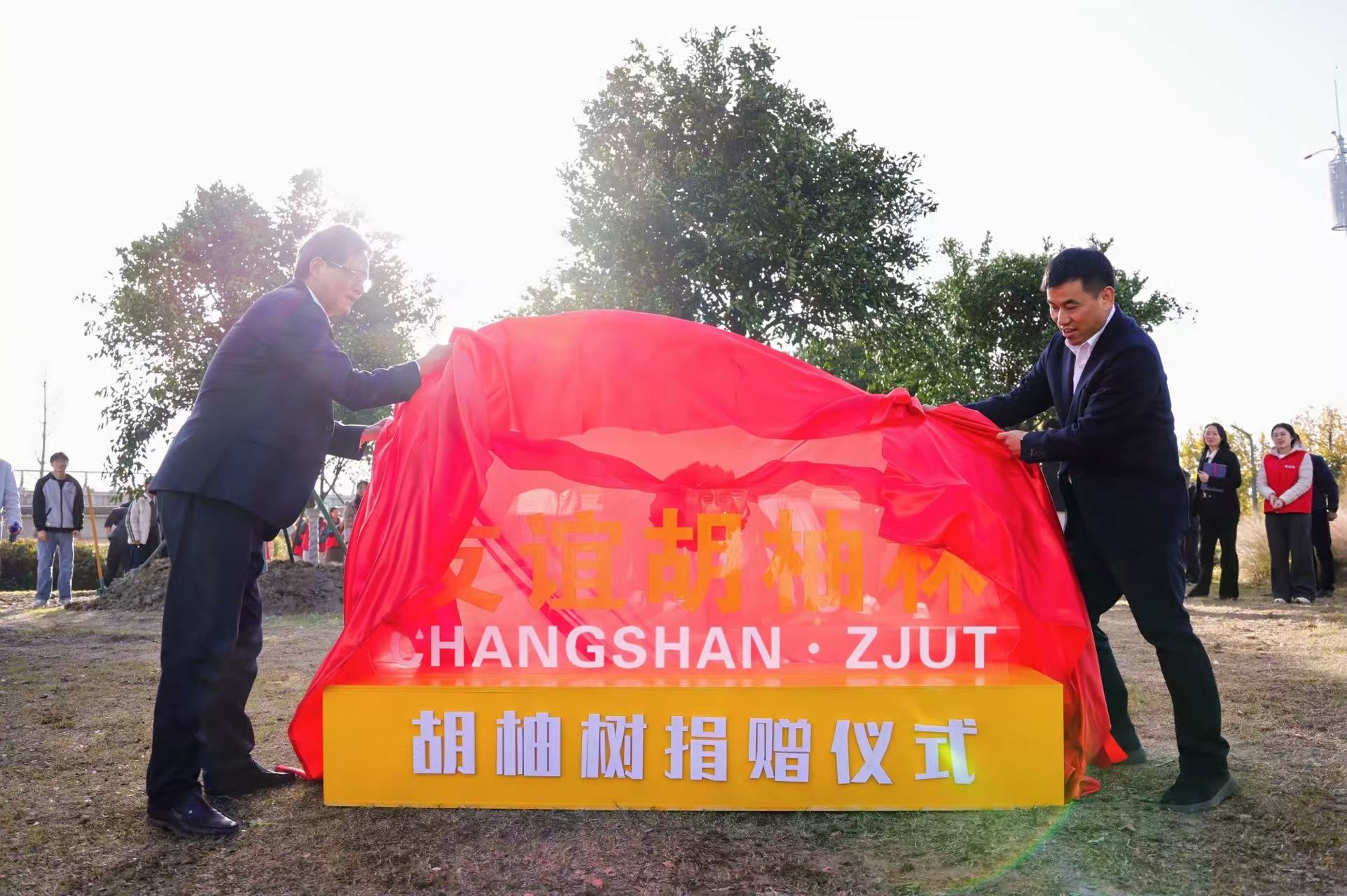 活动现场,常山县向学校捐赠了百棵胡柚树。双方领导挥锹培土、共植“友谊树”,并浇灌定根水,寓意校地合作落地生根、枝繁叶茂。