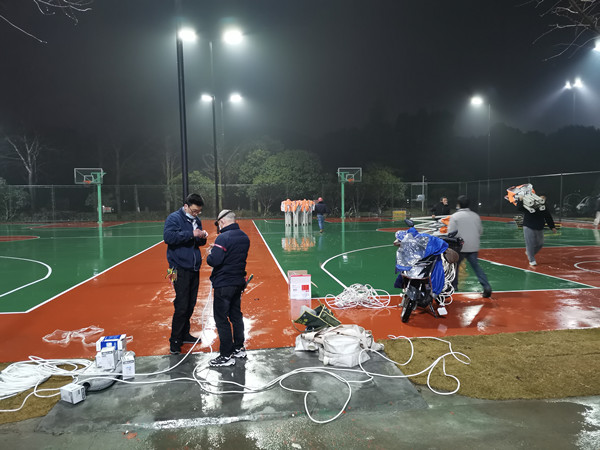 园林修建中心发动所有工作人员,整合所有电线、插座、照明灯具等物资运至现场,并在最短时间内安装完成检测现场所有的照明设备。此外,中心还安排了4名电力工作人员值守核酸检测现场,确保现场用电正常。