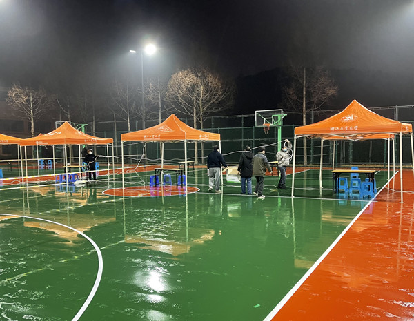 物业会务中心在接到任务后,第一时间组织人员布置核酸检测场地。工作人员在天气状况恶劣的情况下,冒着雨雪在寒风中用2小时的时间紧急搭建起、布置18条检测通道、30余个使用区域。