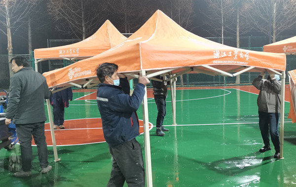 招标与采购中心、校医院紧急调配一次性医用口罩、防护服、耳温枪、暖风机、矿泉水等各类所需物资。此外,招标与采购中心还根据当晚的天气情况,加急采购了一批取暖设备送至检测现场。
