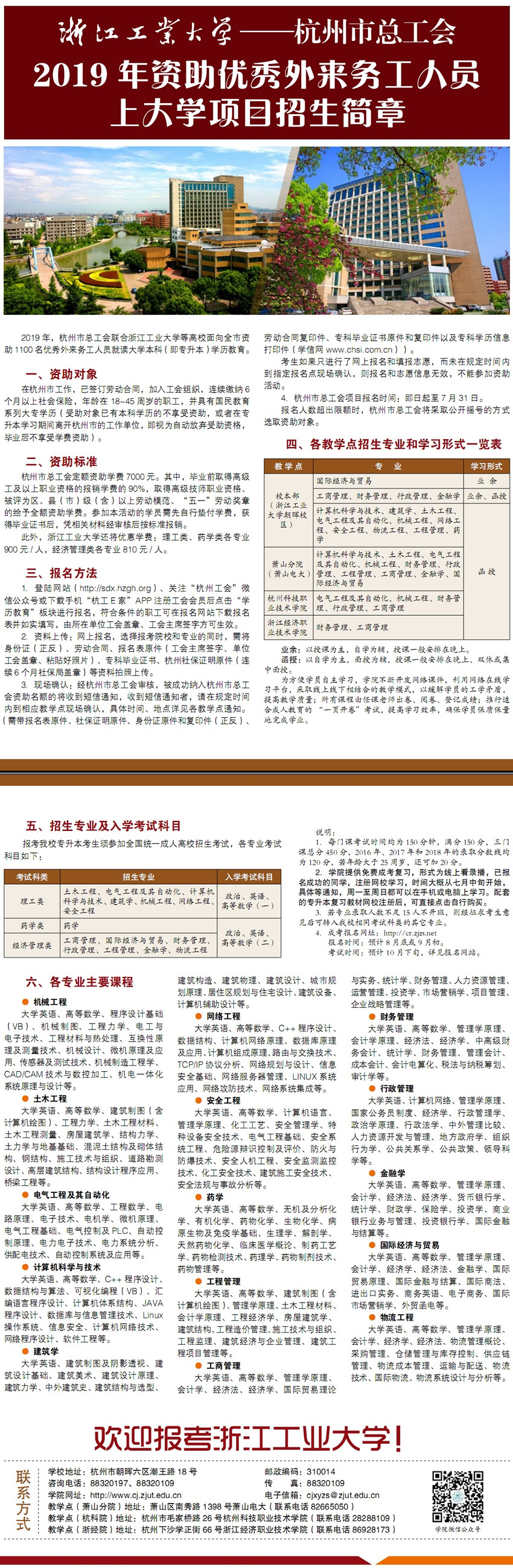 杭州市总工会2019年资助优秀外来务工人员上大学项目专升本招生简章