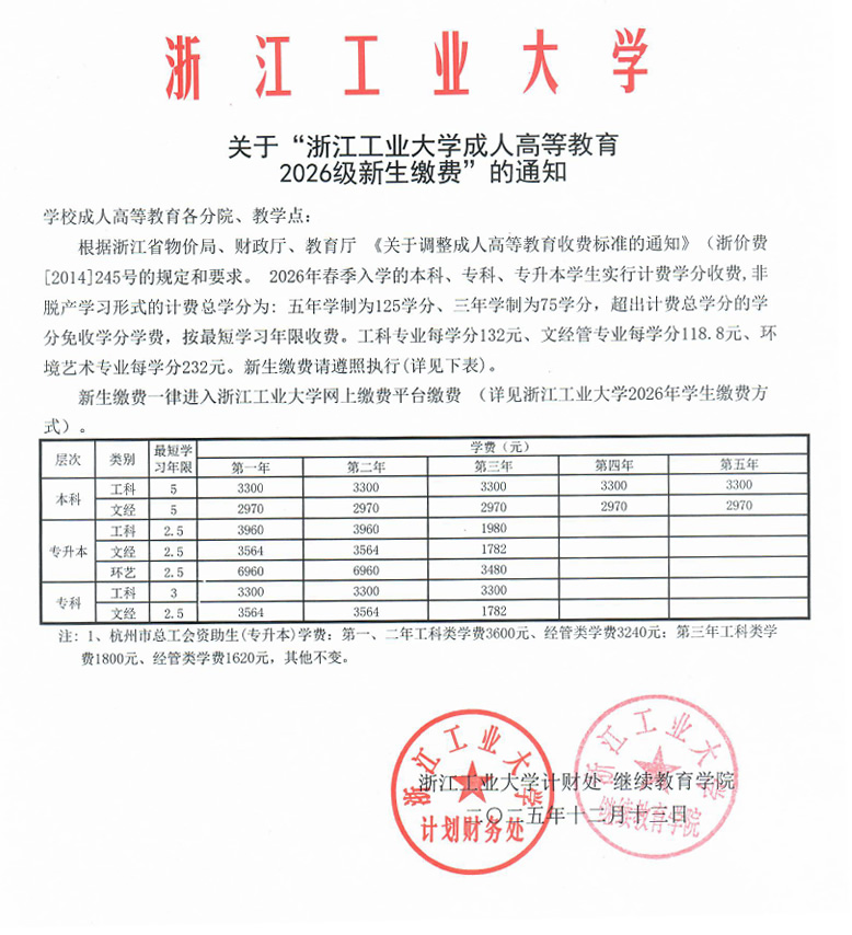 关于“浙江工业大学成人高等教育2026级新生缴费”的通知
