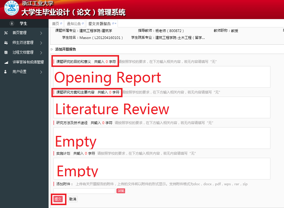 Enter your Opening Report to “课题研究的目的和意义”,and your Literature Review to “课题研究方案和主要内容”. The rest of the columns fill in “Empty”